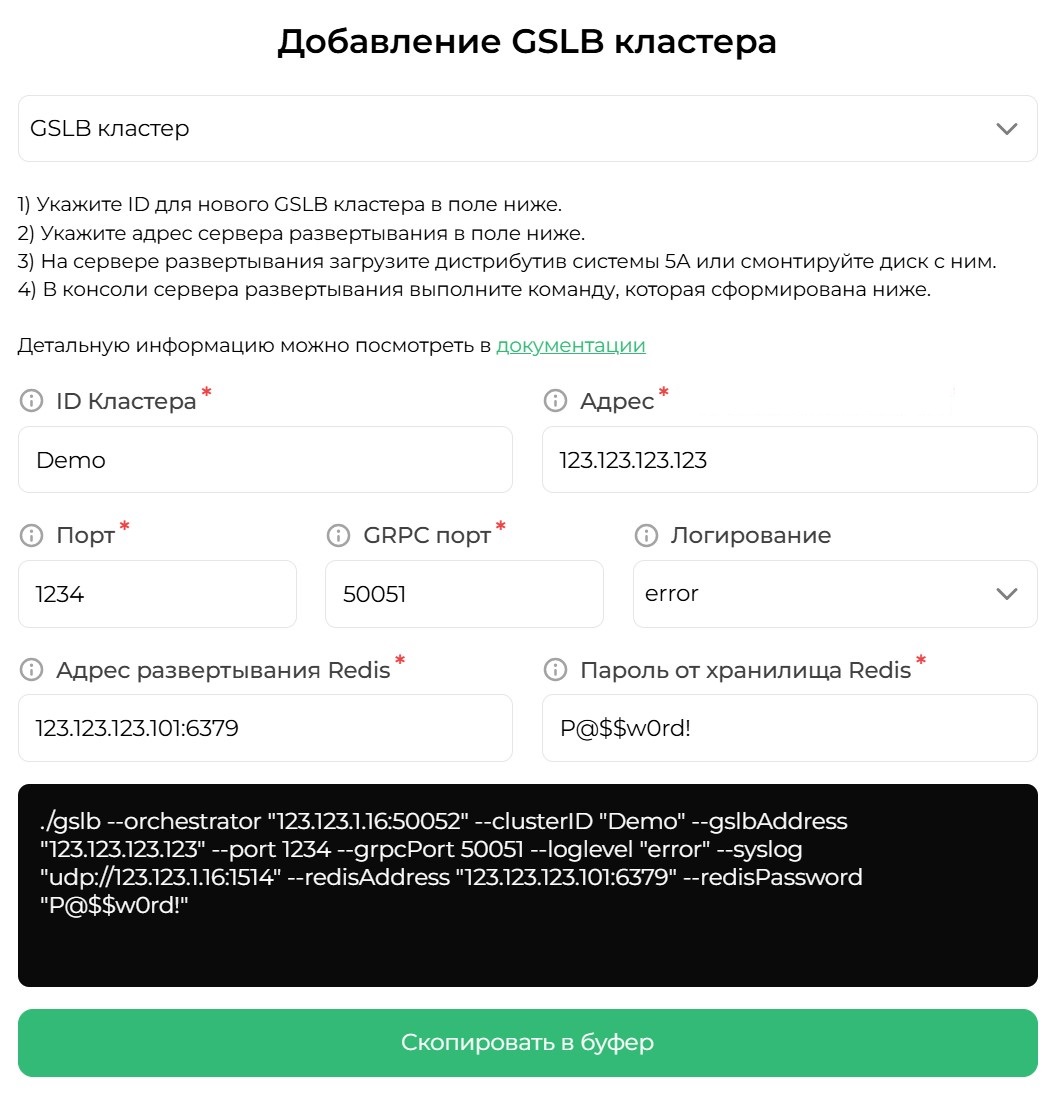 Создание нового кластера балансировки выполняется администратором не из интерфейса системы 5А, а при развертывании модулей балансировки. Подробные шаги по настройке параметров нового кластера балансировки описаны в инструкции по установке на этапе развертывания агента.
